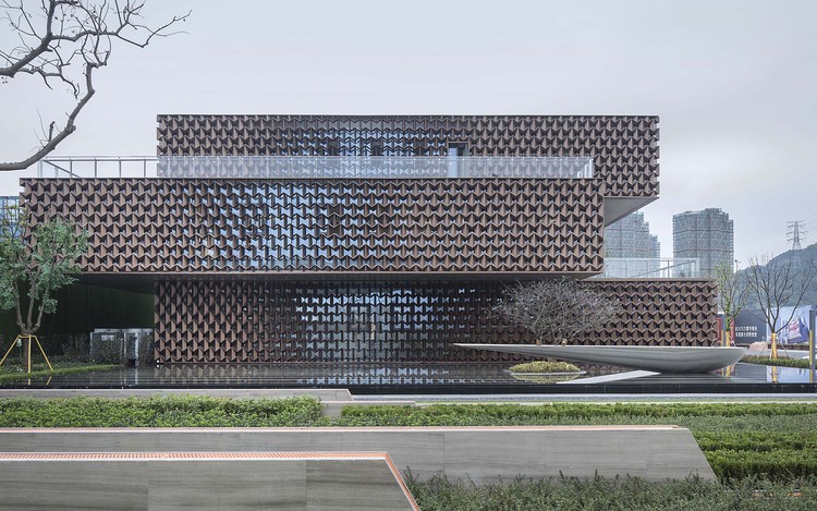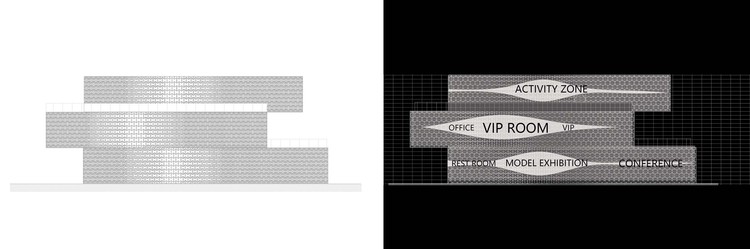 外立面上渐变的开合很好地呼应了内部空间开放性,相对开放的空间如模型展览区域,贵宾室和活动中心则对应相对较疏的立面开口,从而增强与外部环境的渗透;而私密空间如办公室、卫生间则对应开口密度相对较低的立面。
