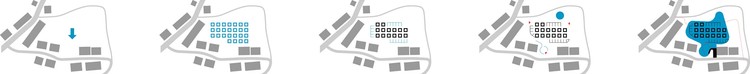 首先排列出的是25个标准售卖单元的阵列,它们占据场地中央以建立秩序,再将外围的单元改为朝内的门面,完成空间的闭合,界定出建筑基本的边界。最后,利用其它的辅助功能来和复杂的周遭环境做“推手”:在主入口处用矮墙围合出前广场,柔和的填充民宅间的缝隙;垃圾站与厕所置于远离居住区的北面,顺应水渠蜿蜒的方向探出建筑主体(图二)。