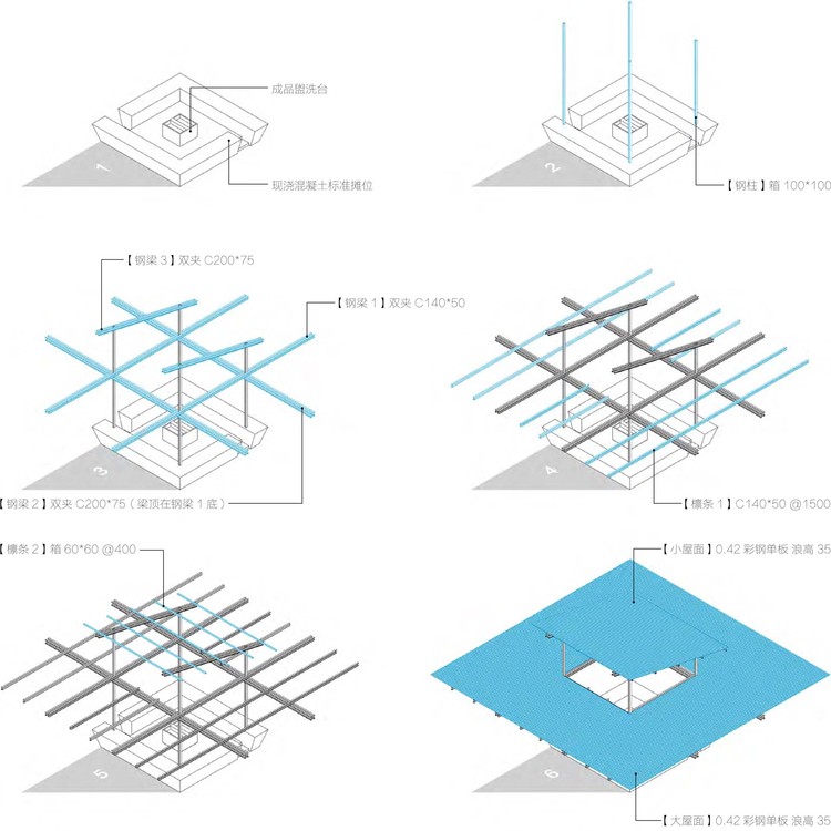 农贸市场主要由钢结构搭建。在梁柱的交接上:采用双夹C型钢梁从两侧分别铆接在钢柱上,且主梁与次梁在高度上错开。这样的连接方式不仅方便施工,更使得各构件保持独立完整,结构逻辑清晰易读(图五)。最初的设想是在梁下增加金属网吊顶,使钢结构若隐若现,希望在抽象空间与建构表达之间谋取一定的平衡,但最终由于造价的限制而取消。