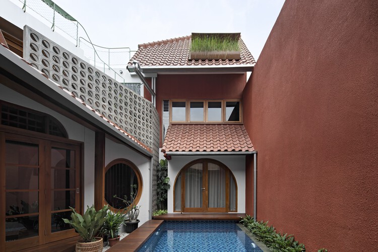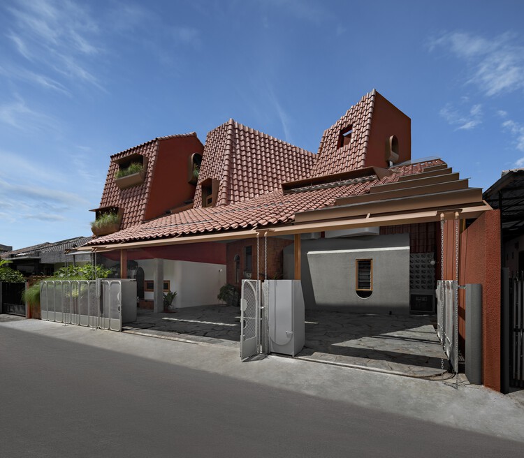 在使用传统爪哇房屋的屋顶(建筑外观以带有粘土砖的屋顶为主)的同时,我们也选择使用印度尼西亚社会所熟悉的粘土瓦屋顶材料,尤其考虑到周屋环境为旧定居点的情况下,那里通常都是粘土瓦材料制作而成的倾斜屋顶。我们努力将这栋建筑与周围环境融为一体,同时,通过使用当地的印度尼西亚屋顶,使其 更具特色,更加现代化,但仍然会让人回想起原始的形式。我们使用的其他一些熟悉的建筑材料有砖、水泥、天然石材和木材,然后我们继续将其延伸至房屋内部。