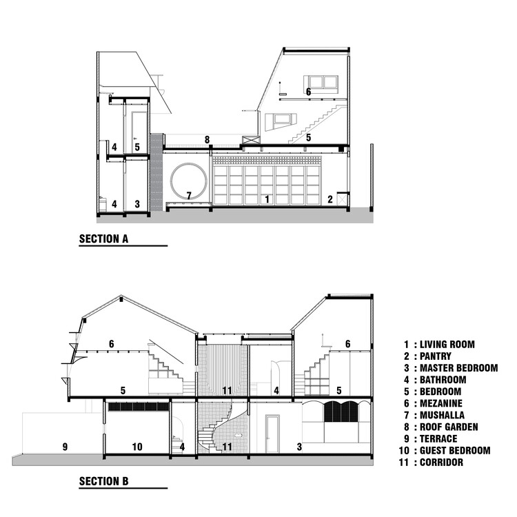 住宅的居民功能:此住宅旨在满足一个大家庭的聚会祈祷需要,可以同时容纳很多人。针对该问题,我们设置了一个与祈祷室直接相连的公共空间(家庭室、餐厅、开放式厨房)。因此,如果需要的话,祈祷室可以直接扩展到面向基卜拉的公共空间区域。该住宅内,会有7人常住,偶尔还有几十名大家庭成员,他们会经常在某些时间,比如周末、假期或特殊日子,在此留宿过夜。在这个不算太大的空间上,为上层的房间专门设计了一个夹层空间,以此来满足这些需求。这样一来,由于增加了垂直方向的空间,房屋就不会占据太大的地块空间。