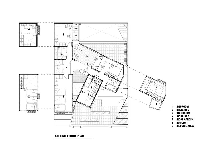 该建筑形式的特点设计来源始于爪哇屋顶(源自印度尼西亚某地区的当地房屋屋顶),同时这也是居住者的梦想,因此我们根据空间的功能对其进行应用和改造。berunjung(传统爪哇房屋屋顶的术语,即高耸的屋顶)体量比例巨大,其下方是带有夹层的港湾式房间,也相当于是正面的服务区,而倾斜的屋顶则用于遮蔽露台和充当车库,以及用于突出房屋内部的屋顶。这种新颖的改造方式则加强了居住者分心的效果,大多数房屋的方向已随着下面的空间朝基卜拉面进行旋转,改变了原有形式特征,使其更加具有特色。