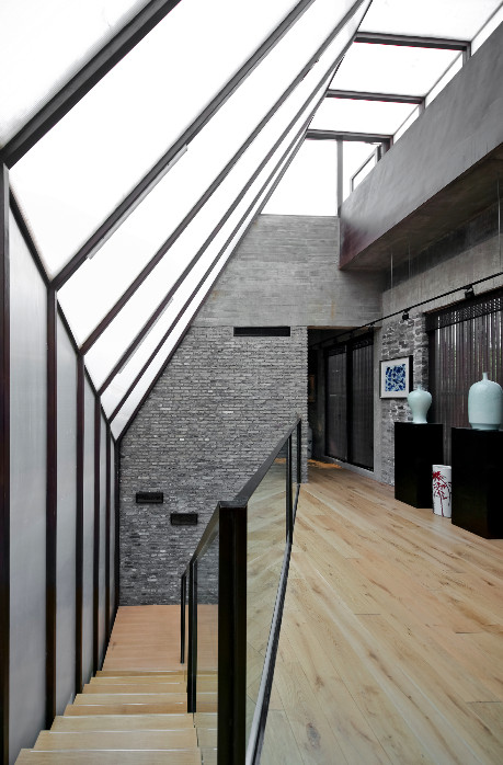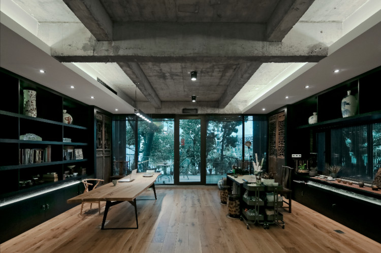 场地上的大树成为了我们南侧的重要遮蔽,使得二层的露台不会直接暴露在正对的一条小路前面,同时也为露台贡献了不同季节的多样风景和光影特质。作为陶瓷艺术家展示、交流和工作的场所,空间的布置简洁而不失特点,混凝土、青砖等朴素而带有一点点粗糙质感的材料与陶瓷艺术品相映成趣,建筑低调的成为了作品的背景