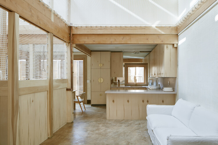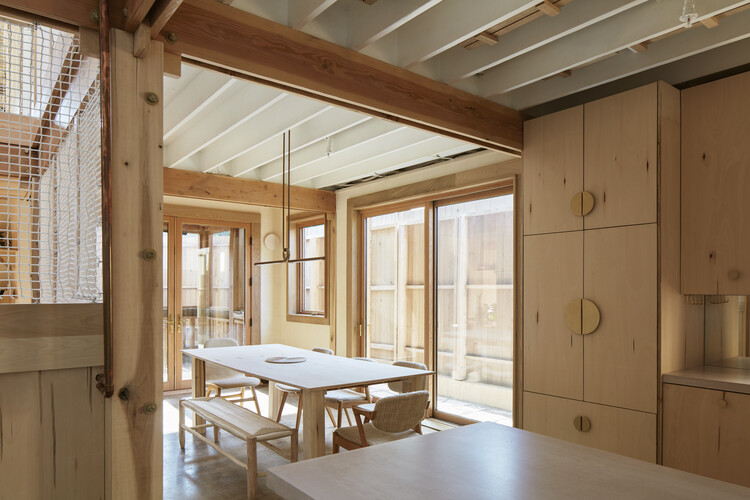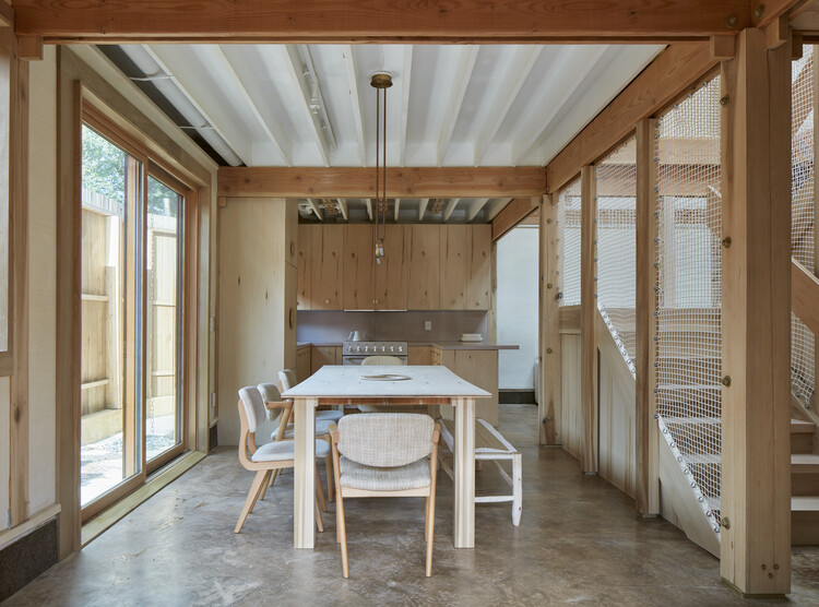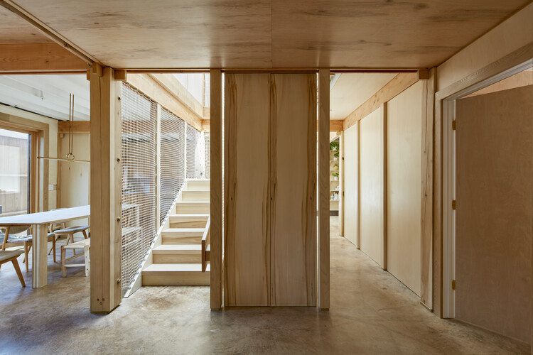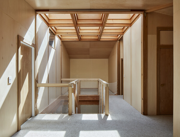 中庭的光线穿过中央楼梯和双层通高的起居空间,渗入相邻的厨房和图书馆。 在生活空间上方,一张网是孩子们玩耍的地方,或者是一个舒适的地方,可以在午后的阳光下阅读而不会阻挡下面的光线。 它的质地与楼梯的围护结构相得益彰,在柔和明亮的光线下点缀着整个空间。 阴影笼罩着房子的深色牛奶漆和软木覆盖的主卧室套房及其洞穴般的舒适感。