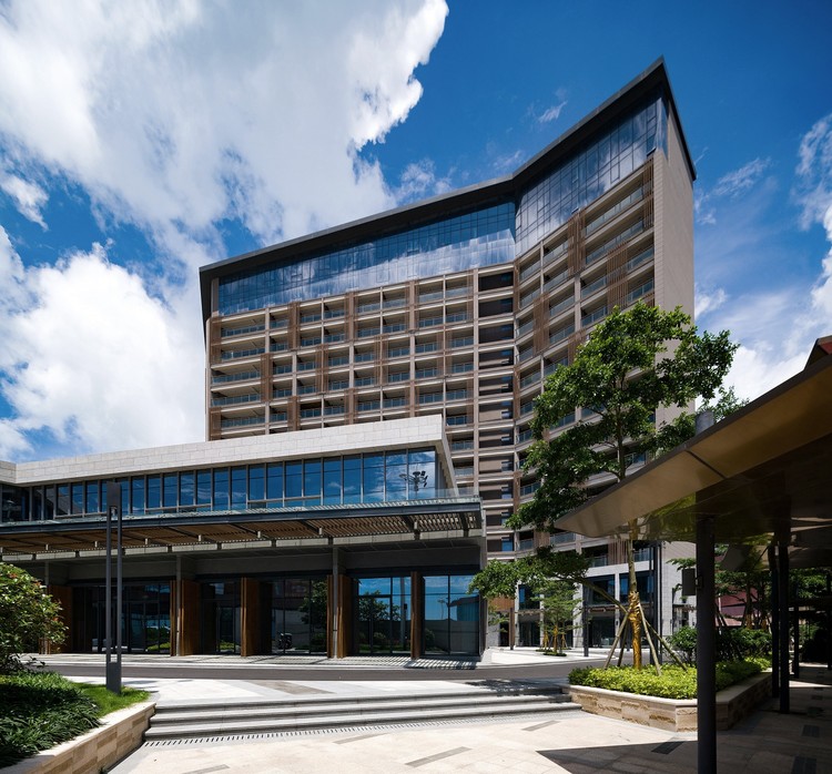 酒店屋顶的“之”字曲折造型打造出生动有趣的海滨天际线。酒店立面采用开放式走廊循环系统,改善走廊自然采光和通风,避免传统酒店走廊封闭和易迷路的缺点。立面上设有间隔随机的铝制仿木格栅,增加了建筑的有机格调。设计特意将餐饮区置于滨水位置,享有引人入胜的景观,与酒店一起成为浑然一体的背景幕。
