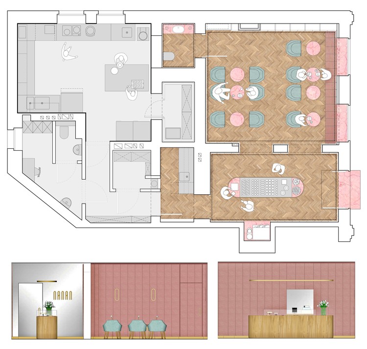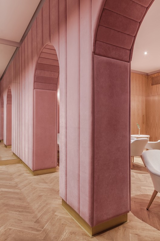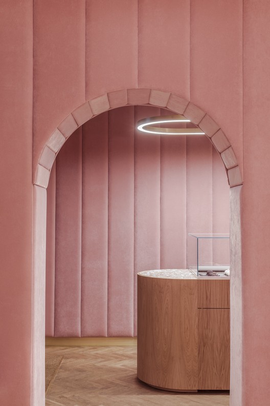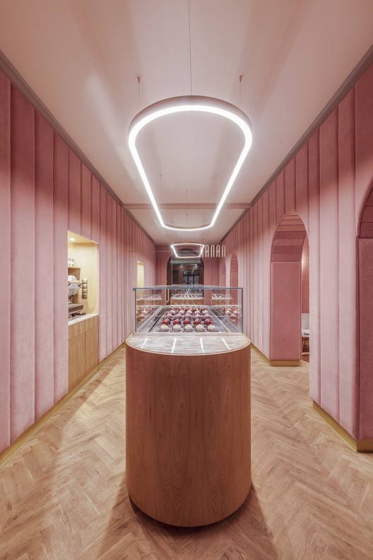 主柜台的形状便模仿了法式泡芙的长椭圆形,并且被放在了糕点店的中心位置,让顾客可以驻足观赏这些如珠宝一样精致、如艺术品一样美丽的小甜品。法式泡芙的形状也在其他的小细节一一展现,如门把手、衣架、镜子和墙壁饰板。整个店内的墙壁和拱门都使用粉色天鹅绒布料铺就,与经典的法式甜品主题风格相呼应。再加上精致闪亮的黄铜饰边,玫瑰色的大理石台面,以及精细的橡木镶板和地板,整个店内充满着梦幻般的甜美气息。
