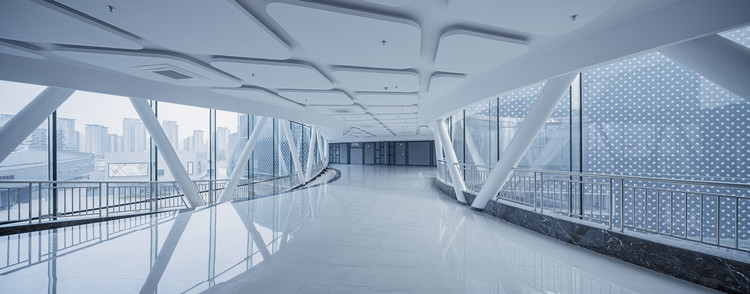 在建筑主体完工之后,ATAH介景领衔设计了购物中心的室内设计部分。室内空间布局顺应橄榄形的一字型建筑体量,购物中心中部形成宏大的全明中庭效果。天晴时,天棚结构的阴影好似一层薄纱洒在浅色系的室内。两组不平行的大跨连桥交织了南北的商业动线。四组自动扶梯从东西两端将顾客从地下一层一直引领到高区的电影院。