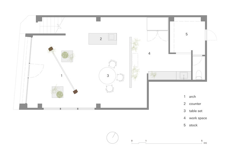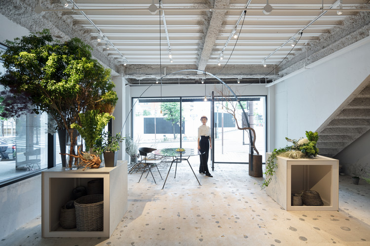 结构支撑被漆上灰色,来承托鲜花的色彩。装置由混凝土板制成,并且我们利用了原有混凝土地板的粗糙材质。店铺后部及胯高的隔断在不遮挡人物活动的同时,限制了繁忙时段工作空间的可见性,打造了一个充满活力的、积极的空间。这样的空间强化了花朵持续变化的布置及表现。