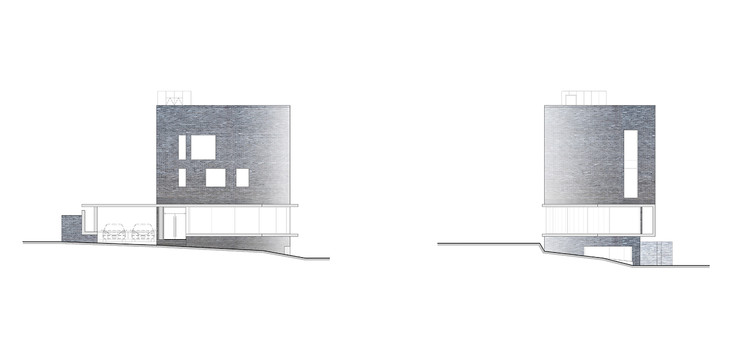 场地的北面和南面相差将近一层楼的高度,很大程度上影响了建筑的设计。建筑师将首层向上升高了半层,从而让这栋楼拥有两个不同的入口,一个通向首层,另一个通向地下室。远远看去,这座建筑像是沥青街道上的一块石头,很完整,很平静,仿佛对一切事情置身事外,又协调着所有不同。然而,人们慢慢走进它才会发现,这栋安静的建筑通过透明的玻璃表达着自己的想法。