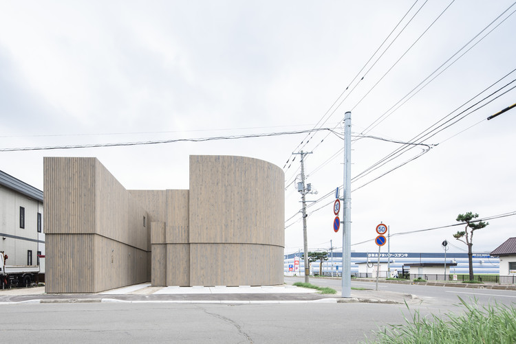 建筑位于北海道东部城镇北见(Kitami)市,商用兼住房。场地三面临街,东部是住宅区。南面与下降近1.3米的临近住宅以一条宽为6米的道路相隔。西面恰好是两条车水马龙的公路,一边是 “ Tonden-dori ” 。北面隔8米宽的道路对面是一所小学。因客户需要店面的三车停车场被置于场地西北方向便于经营出入。