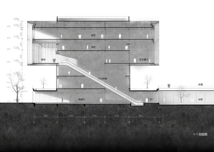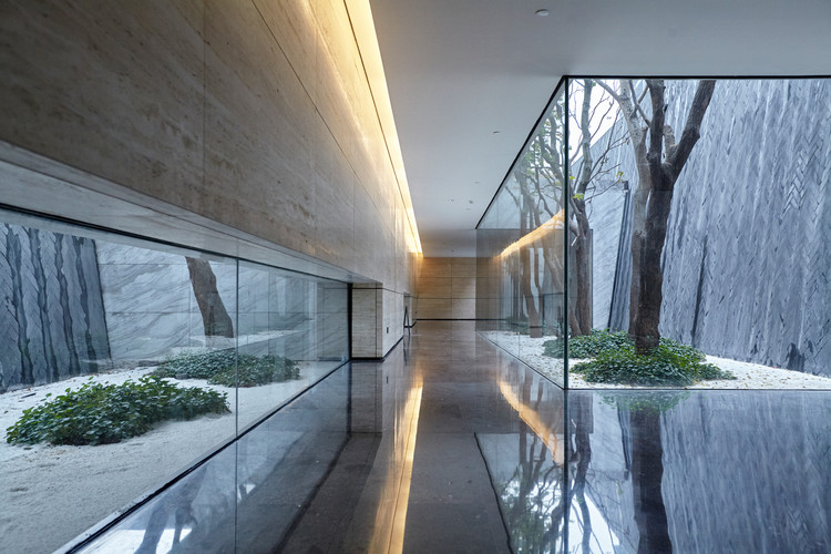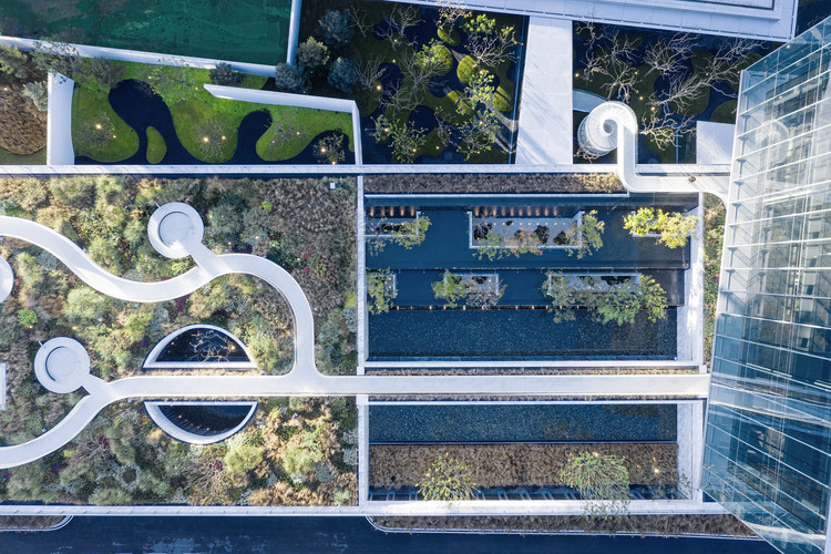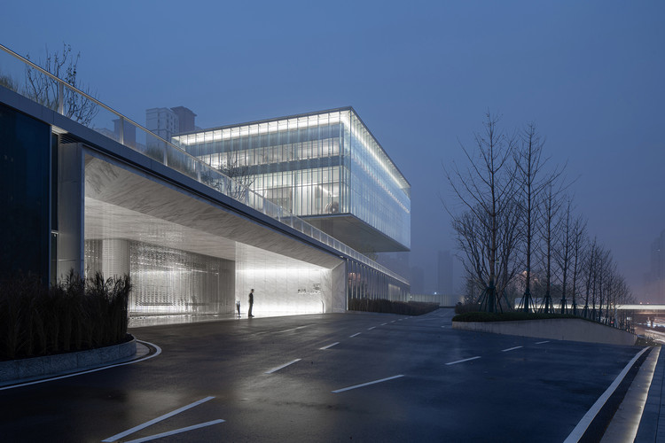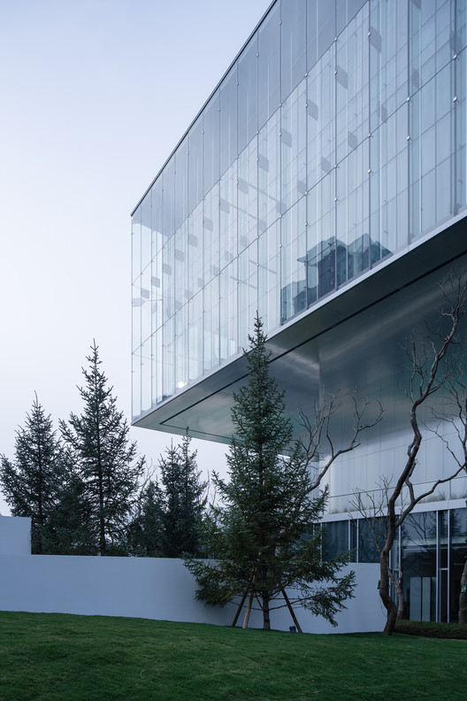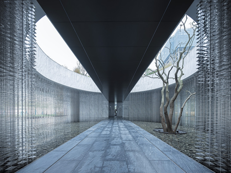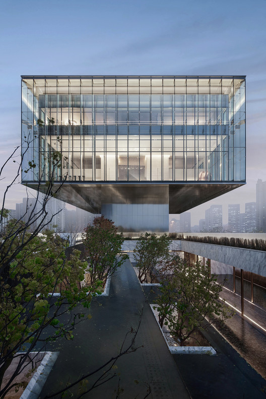 落客区的景观设计与空间流线互相交叠,设计师并不急于让人们抵达展厅,而是需径直穿过一层的景观花园。走过景观区,当人们乘坐88秒直梯,楼梯的终点即是四面通透的悬浮展厅,在展厅回望时,裙房屋顶的景观与场地东侧植物园形成连续的对话关系,景观与建筑序列构成了设计师对空间的叙写,使得情绪与体验在当下自然而然的触发。