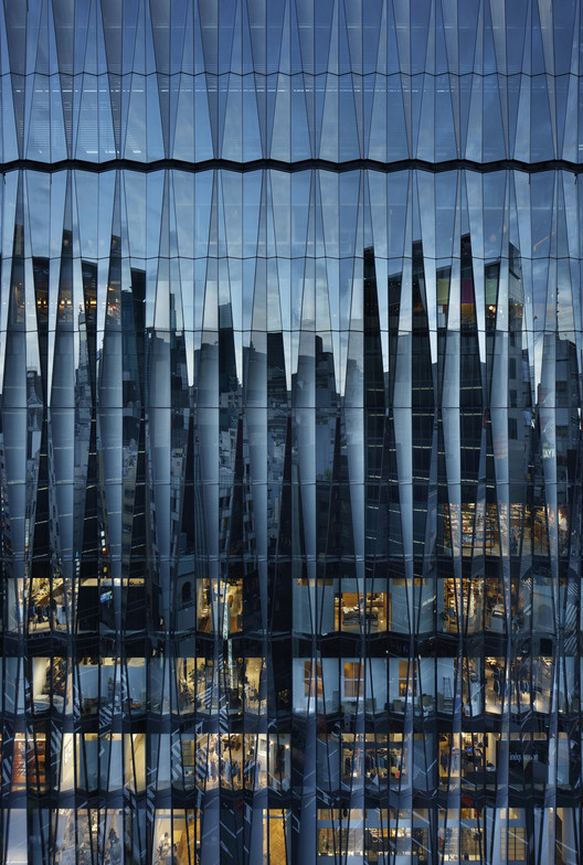 基于“光之船”的概念,在日本传统玻璃切割工艺“江户切子”的启发下,建筑被打造为一艘”玻璃船“。为了增进建筑与城市的互动,建筑外墙主要由玻璃组成,可以对外展示建筑内部动向,同时赋予室内一种城市参与感。日光照射在三维立体的立面上,会投射和反射出不同的光影效果,外立面会随着时间和天气的变化而产生各种效果,并且周围的建筑物和景观会倒影在这艘玻璃船上,使整栋建筑自然的融入银座的城市氛围中。