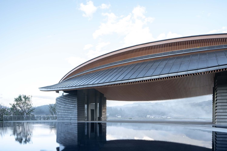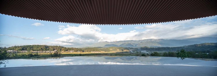 雅居乐腾冲原乡艺术中心位于云南腾冲两江口地区,龙川江西侧的坡地上。遥望东岸,是高黎贡山雪白延绵的山脉,山下是金黄的稻田与农居。每当清晨,江面总是泛起轻盈的白雾,如诗如画。这种建筑与自然景观之间的关系,是建筑师的重要线索和灵感来源。