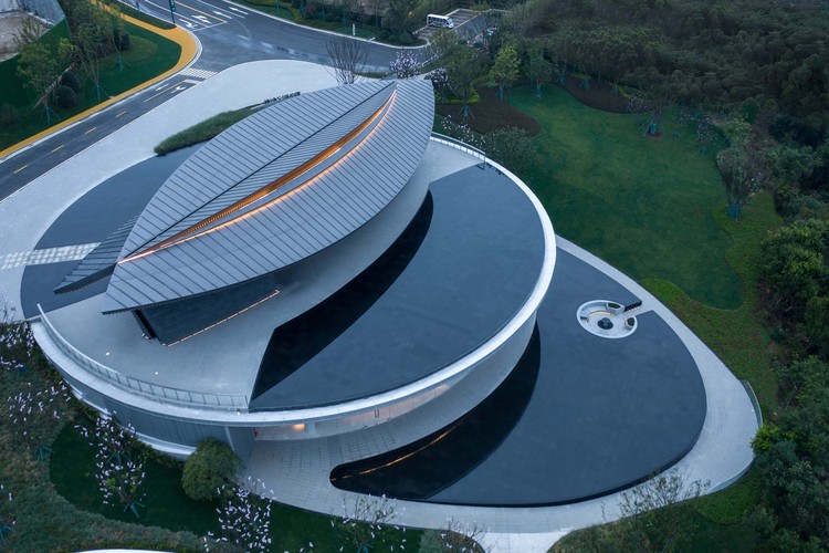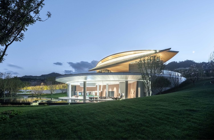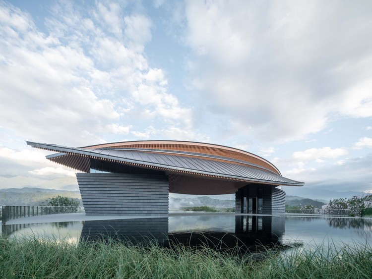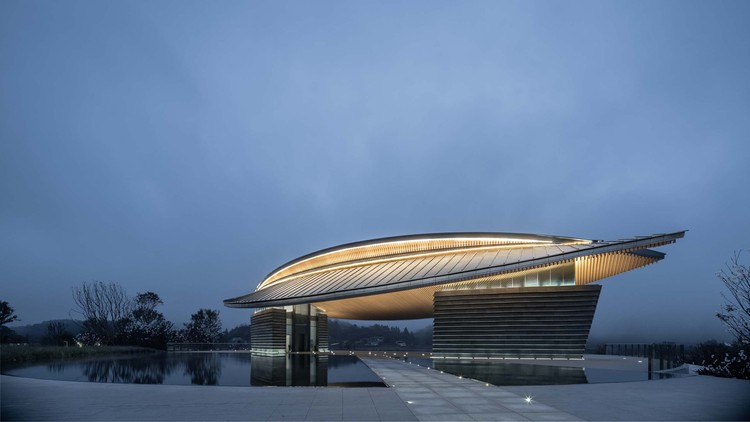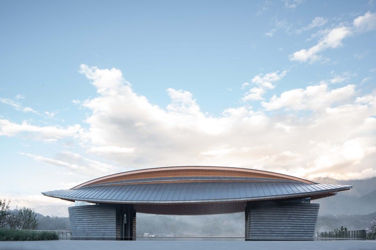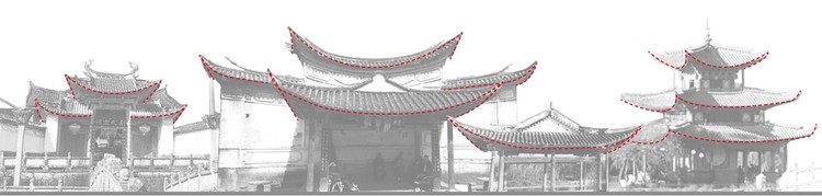 对当地传统民居的建筑形态进行类型学分析,将其屋檐上扬的建筑语言,采用更为简洁利落的现代设计手法加以实现。最终如两片深秋的落叶,飘落于如镜般宁静的圆形水面之上,寓意山间小舟的形象。与云南当地民居产生通感,反映当地特色,实现传统与现代建筑语言的结合。