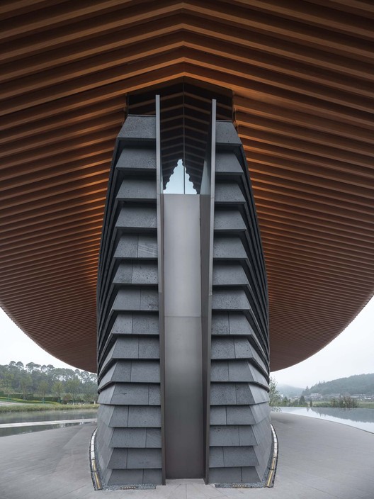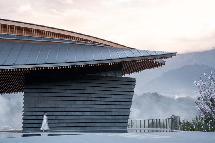 建筑师追求隐于山、融于景、行于画的意境,把建筑融入景色、地形之中。利用场地的高差,将主要的展厅及办公功能隐藏于地下,首层仅放置少量与门楼入口相关的功能,营造逐渐消隐的意境,在景框中使得建筑与景色相融合。建筑师在设计之初,通过多次模拟到访者由远及近不同高度的视线,最终确定门楼所对的方向和位置,令到访者无论在远处还是身处于建筑之中,都能最大限度地感受到建筑与自然之间的互动关系,它们互为对景、相辅相成。