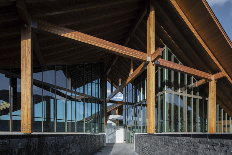 艺术馆主体是一前一后两个巨大的两坡屋顶形态的木结构空间。木结构框架之下,墙体灵活组合引导进入建筑群。屋顶覆盖下产生大量灰空间,从而形成了适应通风、避雨、遮阳等气候特点的室外场所,可聚集较多游客。