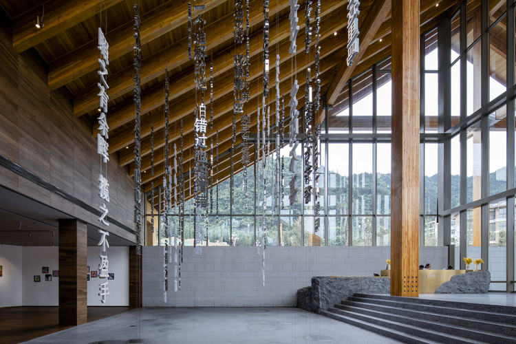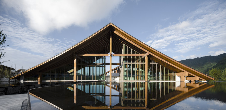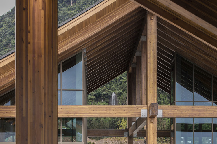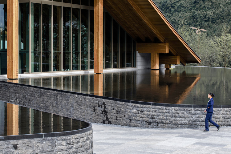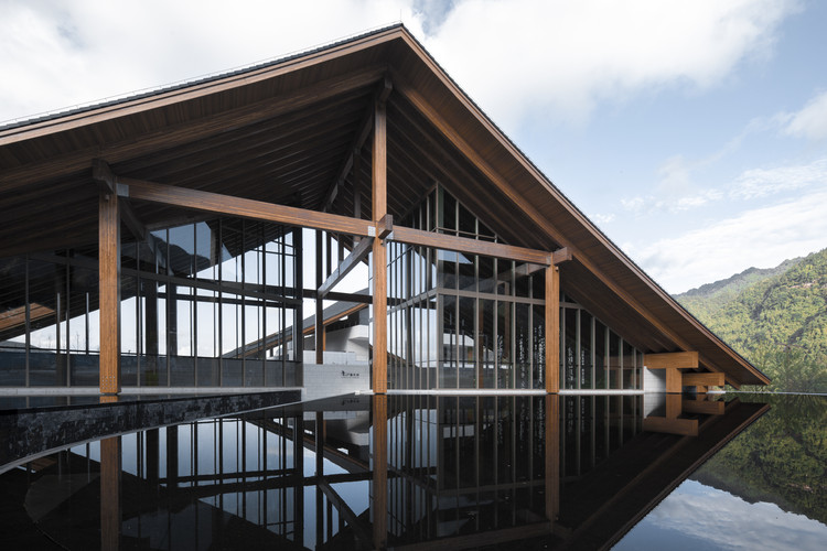 屋檐或直接落地,或檐口与建筑前场无边水池贴合,呈现轻盈漂浮的效果。屋顶的檐下以及在屋顶上的开口形成多处景框,借景周围的青山绿水。