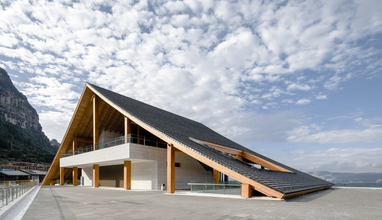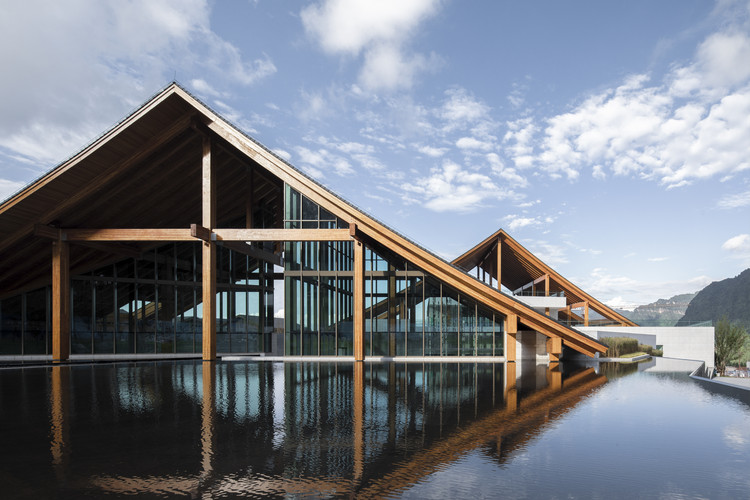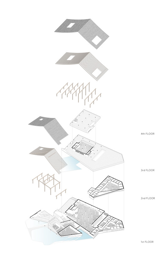 实际的展览空间在其下面以基座的形式出现。屋顶汲取了当地民居的特点,进深和出檐皆巨大,山墙宽阔,微弯的形态带来度假帐篷的意象。