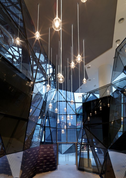 SPARK思邦在入口处为零售商LVMH及其化妆品品牌丝芙兰设计了一个标志性的三层高购物亭,替代了原来入口的咖啡厅,店铺通过一层廊桥与升喜廊相连接。三层高的丝芙兰旗舰店矗立于路口,通过位于二层的穿透新水晶状立面的连接桥与升喜廊相连。