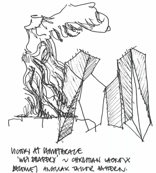 设计灵感来自克里斯汀·拉克鲁瓦(Christian Lacroix)巴黎高级女装展览,其设计的礼服和戏服所采用的独特剪裁和结构形式构成了建筑造型的核心理念。 建筑的沿街商铺店面采用水晶般的玻璃和石材面板包裹,坚实感的断裂和透明感的穿插打造了独特的街景。改变了既有建筑的全貌,生成一种现代经典的风格, 在繁华传统的商业环境中脱颖而出。这是SPARK思邦第一次在马来西亚采用轻钢、石材和玻璃立面的设计,应用了法国RFR工程公司的尖端立面技术,该团队曾负责巴黎卢浮宫的玻璃金字塔结构设计。