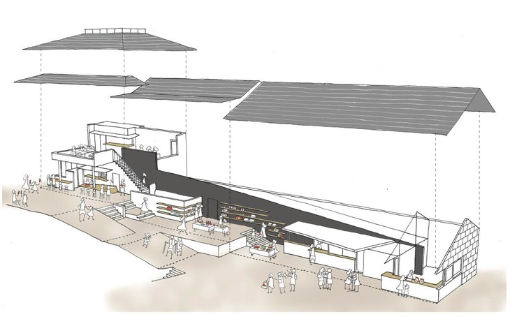 大楼前的街道有40米长,坡度高差高达1.8米。因此,我们决定利用这一特点,将街道与室内设计进行一个全面的考虑。其结果是,利用场地上的高差将咖啡、餐饮和纪念品销售设计出了三个层次,这不仅其综合到“同一个屋檐下”,还解决了客流流失的问题。