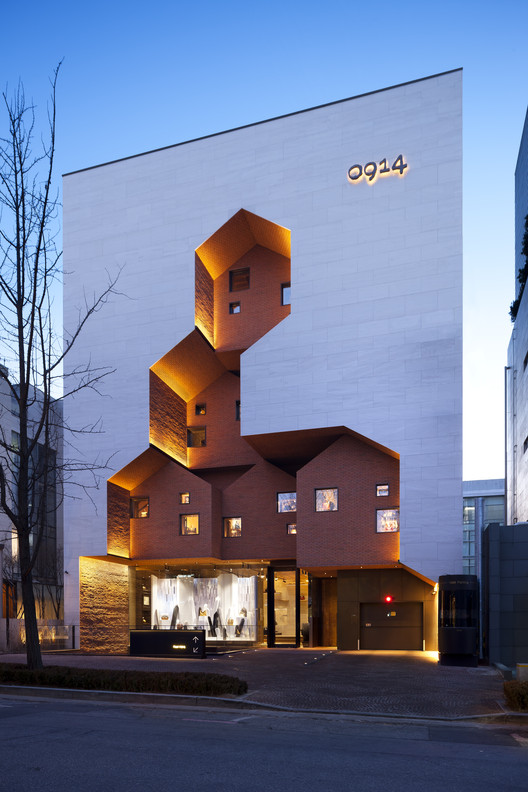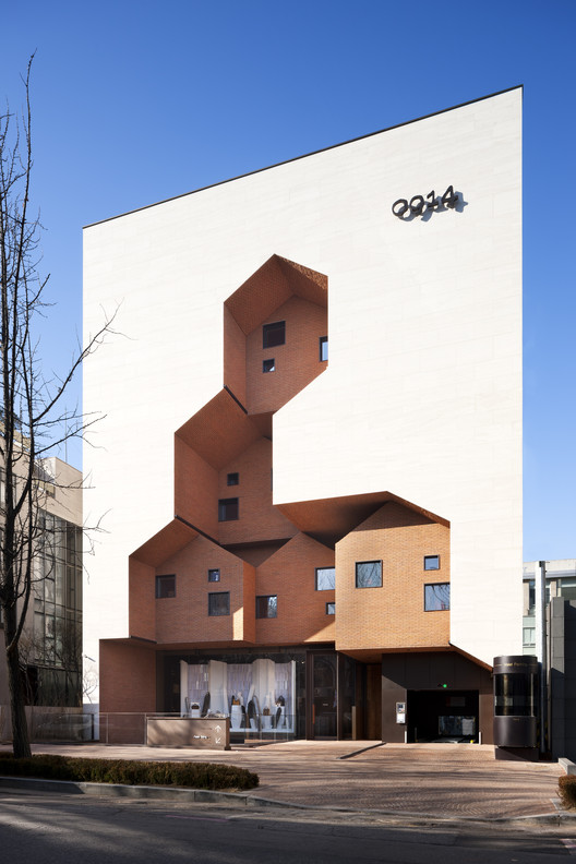 来自建筑师。0914旗舰店的是韩国高端皮革手袋公司Simone的多功能商业空间。Simone是一家奢侈手袋的原制造公司,他们已经为Burberry、Michael Kors和Coach等高端品牌服务了30年。Simone以享誉世界的制造质量为基础,推出了他们的第一个奢侈品牌“0914”,并在首尔高端时尚商业区的中心建立了0914旗舰店。该旗舰店位于Dosan Park街区附近,那里挤满了国际豪华时装店和高级餐厅。
