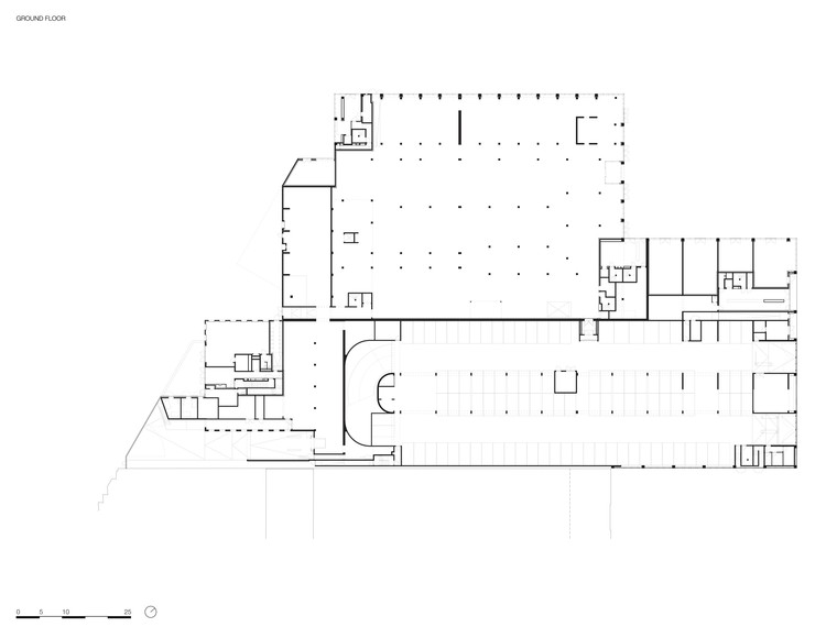 该项目呈现出高度密集的空间功能模式,包含了商业空间、超市和公共停车场。在这个基础之上,建筑师还设计了两个五层的居民住宅模块,以提供172户居民的居住所需。这两栋居住模块,其中一栋是面向市场出售的,而另一栋则是用于公共住房所需。
