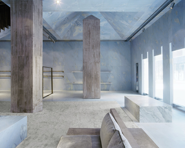 建筑师用大理石外壳包裹了现有的二层结构。整个旗舰店,外墙、地板、墙壁、天花都统一由大理石制成。