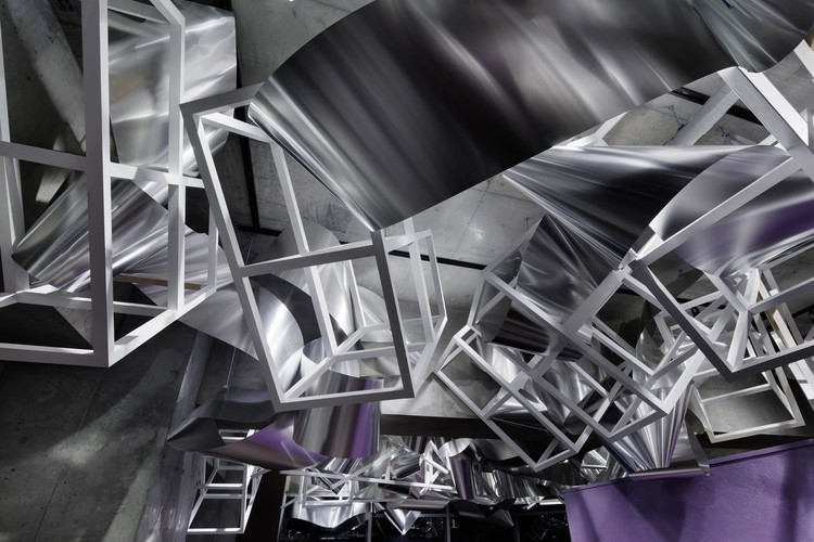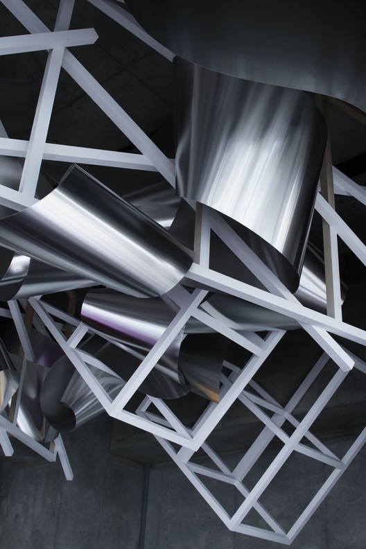 光线的发射有着丰富的表达性,更是通过白色网格结构和金属波浪的相交被强调出来;前者穿过空间,像是粼粼闪烁的白色水流,而后者则像是另一条水流,充斥着生动的活泼感。