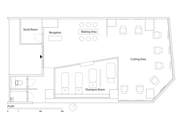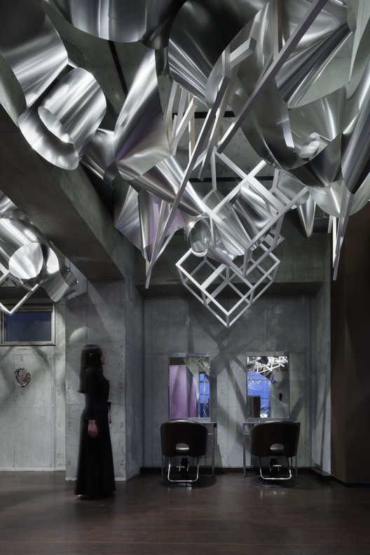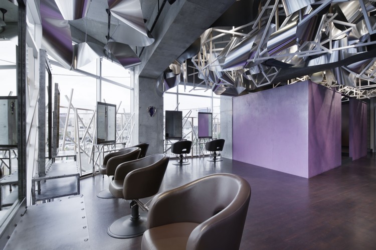 更多的是,建筑师们使人们在这个空间中感知到每分钟间光线的变化,不论是一天之中,还是季节交替。通过精密计算出白色网格和金属波浪交互的方式来增加金属波浪的盘绕感,金属波浪成为剪发区中的反光物体,让最多的自然光进入,也让不断变化的光线纹理最多地被感知到。