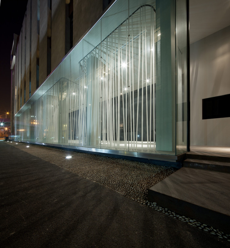 稍微被抬离地面的巨大立面窗橱在园区狭窄无趣的内街里呈现奇妙的景象:阳光下,窗橱接近一个镜面,反映着周围的城市景象,黄昏或入夜,室内的展示和活动景象则透过玻璃面往外投射。对于外围欣赏的人们,这扇景窗所传递的景色似乎是虚拟的,而对于入内游历的人们,他们的感受却是真实的。
