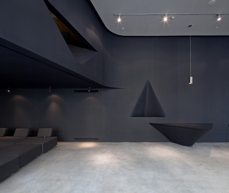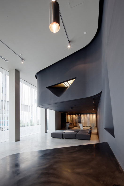 设计中心的日常使用分为展厅和内部办公两部分,首层的展厅由两个区域组成,朝玻璃窗橱开放的展示区域和相对隐匿的酒吧区,内部办公部分则设在酒吧区上方的建筑夹层中。内外两部分空间通过一道沿纵向内墙延伸的黑色曲面墙体分隔与连接,墙体在酒吧区上方向外立面卷曲,在原有夹层空间之外包裹出一个悬空的会议空间,并成为内部和外部使用空间之间的交集。曲面墙体局部自由地外凸或内凹形成多个小型展台,与空间有机互动。展厅的另一面则是一道由413根半透明PVC管构成的通透曲面帘幕,蜿蜒在展厅空间之中,与外立面玻璃幕相互观照,若即若离,不经意间构筑了几个对外场景展示。实与虚、黑与白、动与静的对话在整个空间的中性灰色基调中更具戏剧性,并有效地烘托了石材展示品的天然色彩和纹理。