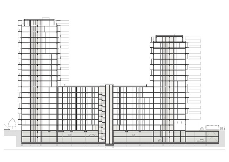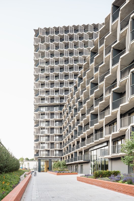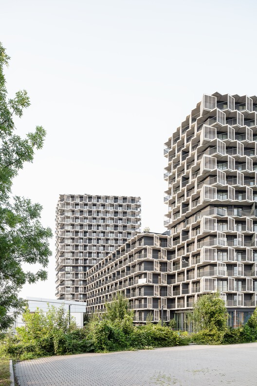 该项目由一座 20 层的北塔和一座 17 层的南塔组成,中间还有一座 8 层高的连接建筑,十分醒目。作为首席建筑师,AllesWirdGut 除了对公寓(从小型单元到家庭公寓,再到带露台的顶层公寓)进行规划外,还重点关注了带有独特立方体门廊的外立面设计。这种创造三维空间的建筑表皮层提供了宽敞的额外室外空间,并起到防晒、防风和防雨的作用。