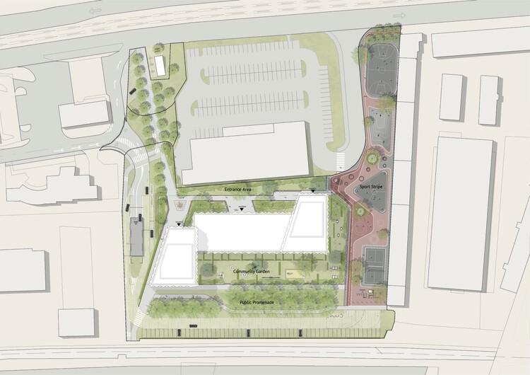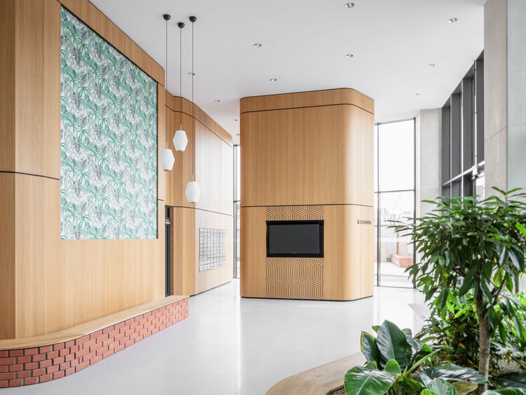 内部的门厅有双层高的天花板,布局和设计宽敞大方,突出了公共使用空间的重要性。本着共同创造的精神,一个国际水准的项目团队与斯洛伐克开发商 CORWIN 合作,Transsolar 负责气候调节和建筑服务,MAN MADE LAND 负责景观设计,raum & kommunikation(与 AllesWirdGut 合作)负责创新的社交互动概念。