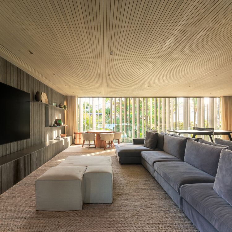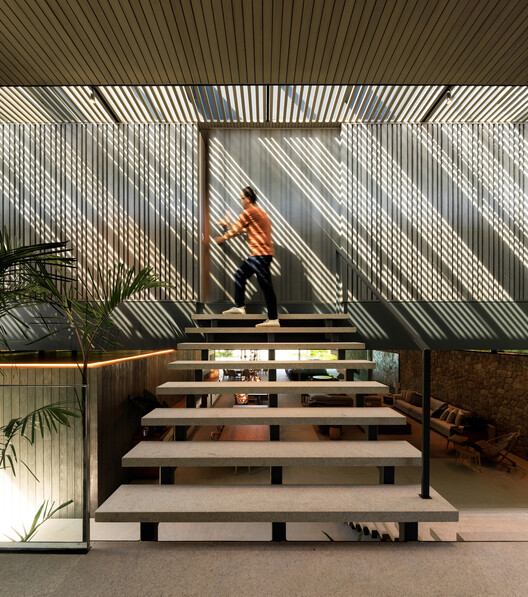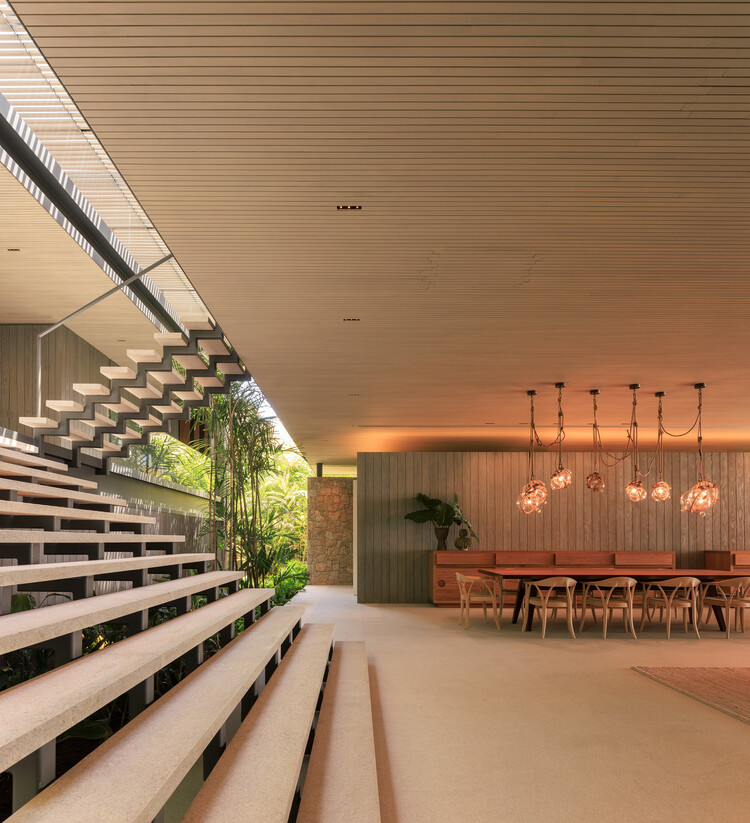 这座住宅位于圣保罗附近大约一个半小时车程的海滩城市瓜鲁雅的一处住宅公寓区内,充分利用了主要景观优势,打造出注重隐私并享受生活和休闲空间的解决方案。这栋海滩别墅是由设计团队的一位长期客户委托建造的,这对夫妇会与家人和朋友常常一起在海边度假。在设计团队首次造访现场时,他们意识到应该充分利用地块后部,那里可以欣赏到海景,也是通往海滩的必经之路。而地块前部则通过公寓区内一条车流不断的内部街道进入,需要更加封闭,而靠近邻近物业的侧面立面则需要视觉遮挡。基于这一分析,设计团队在可建地块的有限空间内构想出一个垂直于进出道路、由细长挑檐支撑的长条形纤细体量。为了保持建筑外观的比例水平,并相应降低建筑的整体高度,设计团队采用了半层高的设计理念。这一方案打破了内部空间的僵硬感,使各个功能区的天花板高度各不相同。