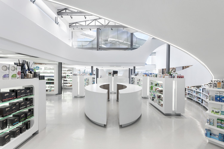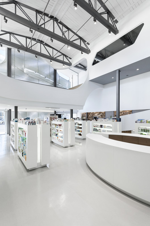 药房的首层是主要的销售区,并配有一个小型实验室。顾客的购物流线,则是通过内部的空间布局来引导的。虽然在空间的整体排布上,是以药品的种类进行划分的。但建筑师对内部空间的主要关注点,则是在于如何让店内的每一位顾客都可以互相看见,以营造一种充满戏剧感的购物体验。