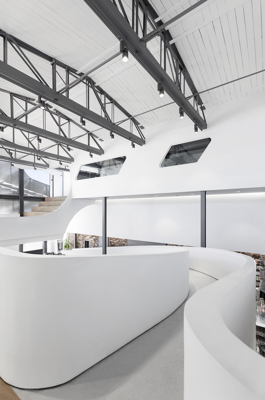 而于药房的内部,建筑师在原有仓库的开放空间里,置入了一个新的夹层空间,以从各个方向串联空间的流线。地面层与夹层,则是通过一个旋转楼梯连接的,旨在连通上下层的同时,于室内创造一条富有动感的弧线。此外,旋转楼梯所形成的弧形空间,为会议室和办公室的设置提供了充足的条件。