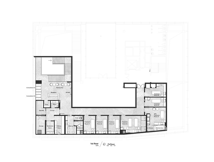 零售和理疗这两个服务功能在竖直方向分开。主题楼梯成为一个边界,和一个规划开放 /私密,快/慢,疗养/spa 空间的过度区域。