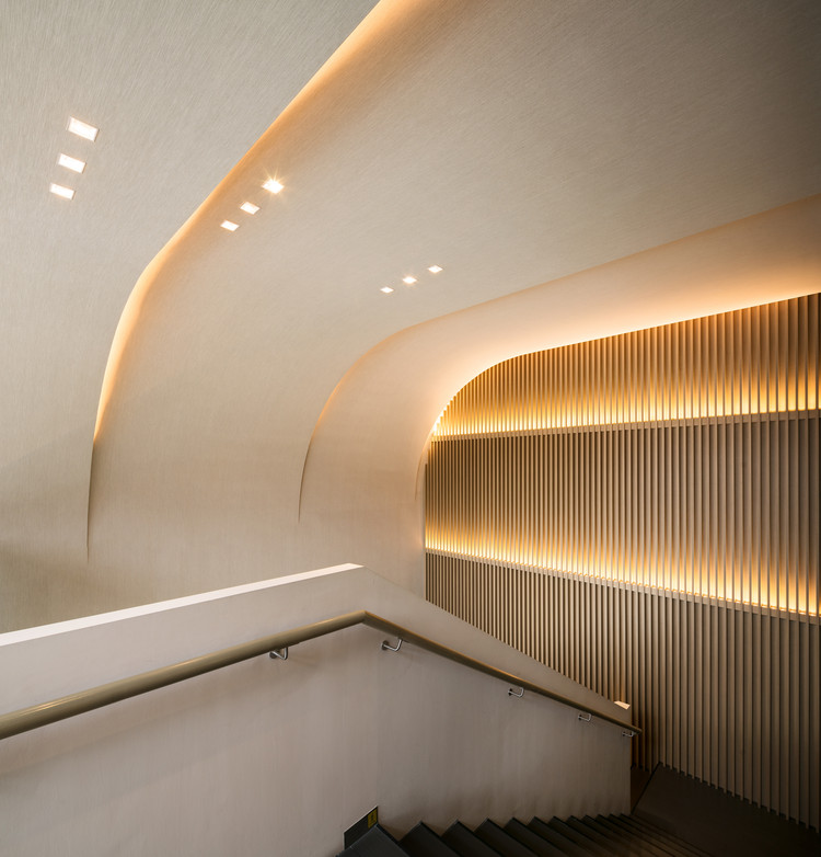 顾客沿着楼梯向上时,天花依次折叠,隐藏的上射灯照亮了墙面,营造出一个温暖舒适 的氛围。第二层的空间单纯地被地灯照亮,这些地灯轻轻掠过墙面的底部,为顾客创造 出一种禅意的体验,带领他们远离城市的喧嚣和繁忙。