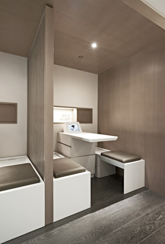 顾客在特别设计的隔间中可以会见咨询师并进行皮肤测试。这个过程处于开放空间中, 但顾客的隐私也可以通过一系列的日式屏风(Koshi,格子)得到保护。