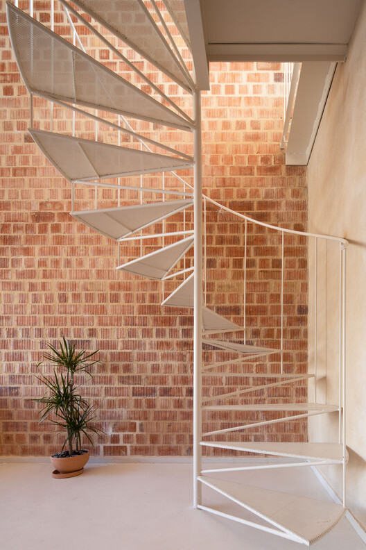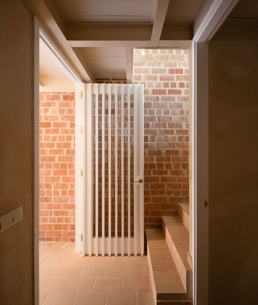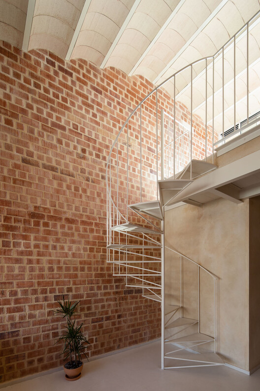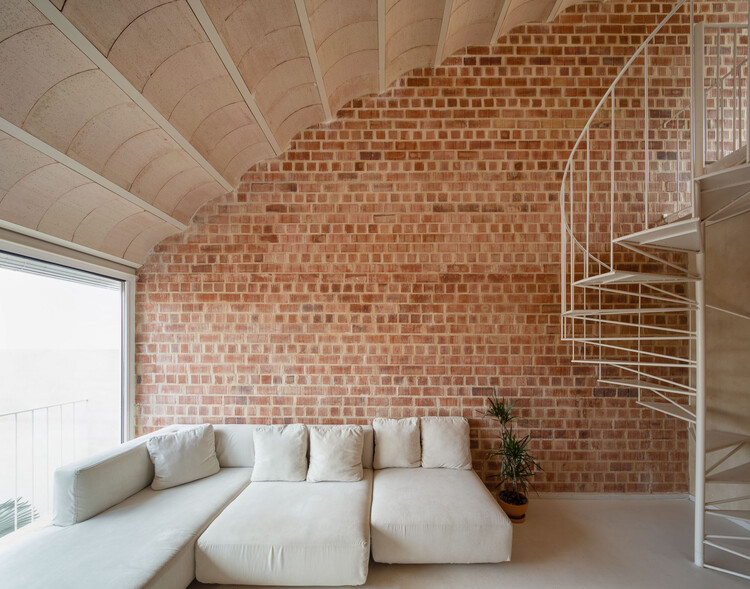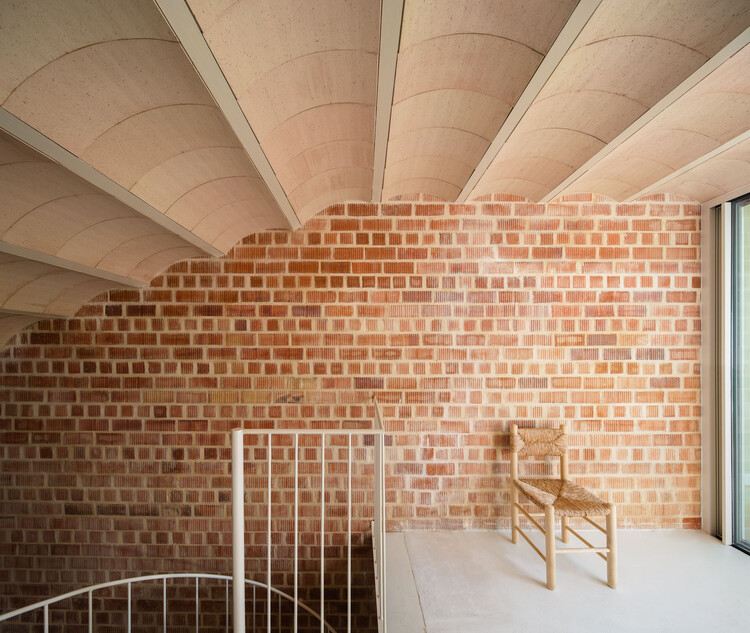 另一方面,通过将夜生活和服务区域设置在较低层,房子中就纳入一个更高的单一空间,在视觉上连接场地中的所有外部空间。同时采取直接且连续的姿态塑造一个拱顶,来拥抱该空间并为其减压。反过来,这个轻质粘土陶土拱顶,作为住宅屋顶的内模,完成了室内空间的围护结构。除了在潮湿区域有装置的墙壁上涂抹了少量天然石灰砂浆外,室内围护结构没有任何其他的覆层。