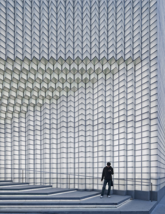 这两种单元的组合创造出了具有雕塑感的三维立面,以及悬挑的结构。通过整合创新性的结构工程以及新的单元节点系统,这一装饰性的入口台阶雨棚具有自然的角度,吸引行人可以从各个角度看到4面展示玻璃。