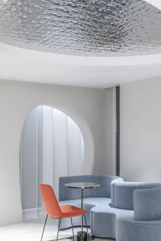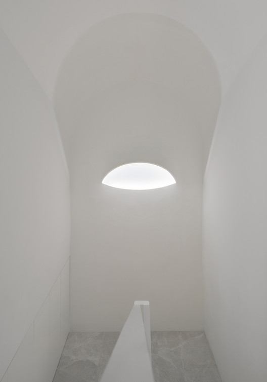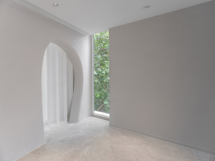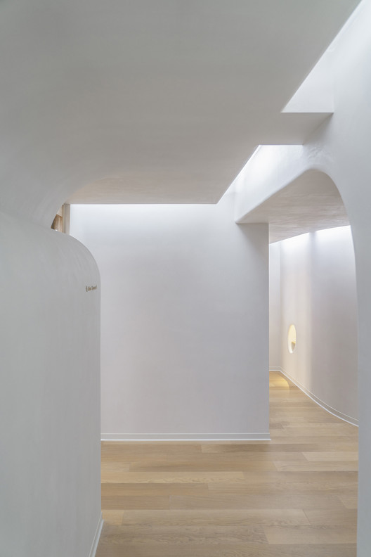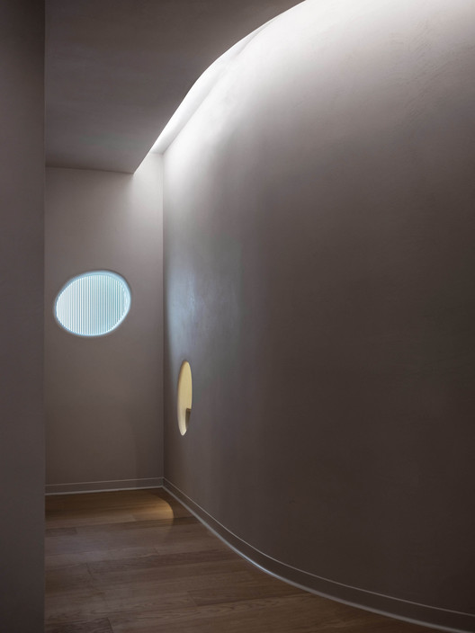 面对这些缝隙中的公共空间我们非常克制,没有冒险的形式突进,仅从尺度和光线着手。这是一条隐性的情绪流线——向上、向内、向光,悬隔日常,认知自我。洞穴间的缝隙和洞口,都是情绪流线中与人互动的媒介。我们用线性灯带模拟自然光,让光线从眼睛不能直视的缝隙中洒落,提供均匀的照度。窗外的绿色和光影,穿过洞口,澎湃的涌入室内。