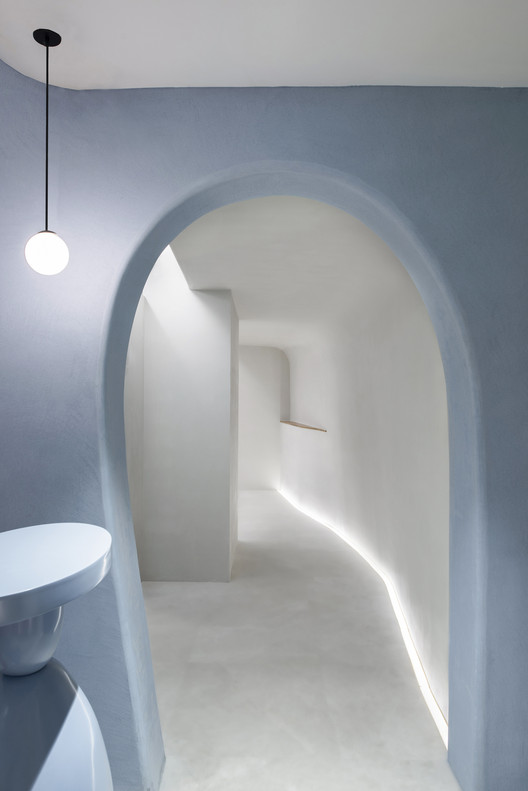 KY 的创始人说,一个安全的房间让她想到“母体”。我们把它留给了最小的VIP室,它是“洞穴”这个意向最为直接和质朴的演绎。于身体,“母体”是呵护与包裹;于建筑,“洞穴”是最原始的安全庇护所。两者天然关联。VIP 室处于二层的一角,也是最难用的角落。房间窄长且低矮,中间还有一颗柱。
