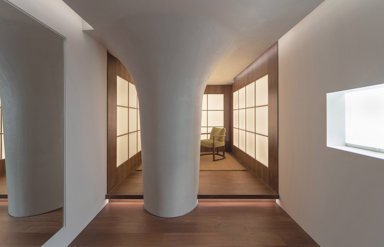 这些恰是设计最重要的线索。以柱为界,小房间被再次划分出内外。上一级踏步,里面的空间更矮,你下意识弯腰,迅速坐下。被包裹成树形的柱子,围绕它或是靠近它,都是空间和身体紧密互动的过程。落地窗被缩小为一个方洞,呼应分格的发光墙体。不断变化的自然光和人工光,时时处于一场对望。