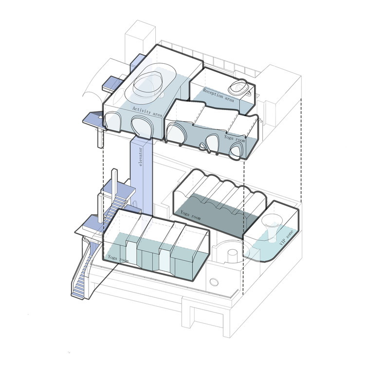 城市修行馆以不同大小的独立房间进行运营。三间操房,一间VIP室,一间会客厅,空间被挤的满满当当,仅留下一些缝隙。它们既是交通,也是有限的公共空间。在树影和蓝色中间,入口是一条向上的阶梯。从这里开始,我们希望每个人都能毫无戒备的走进去。