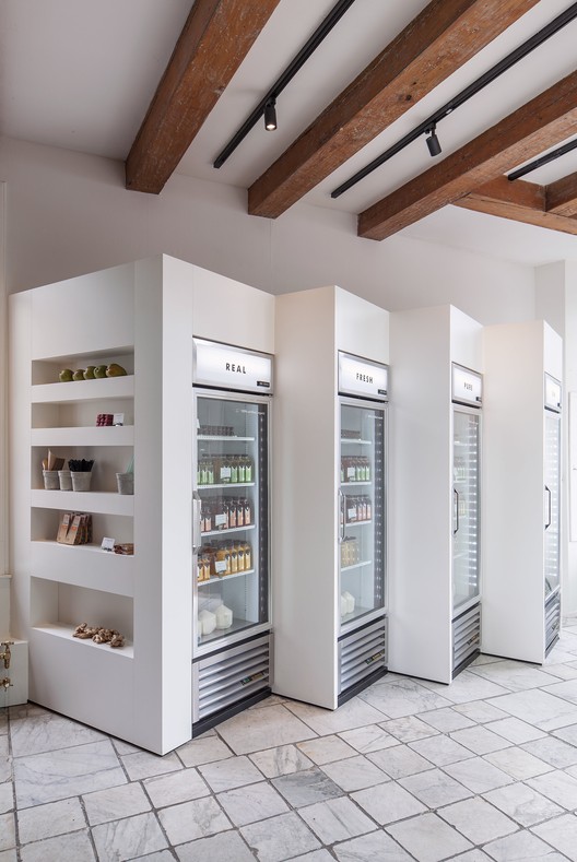 布局使它有可能创建两个不同的世界。在正面,我们有面向Prinsengracht的入口,和一条时刻发生着故事的人工河。随着走进内部,你会注意到Standard工作室是如何保留充满纪念意义的大理石地板的特征。在冰箱所处的位置,包含一系列“外带”产品。冰箱的安置地点是受到来自两个不同方向的运河交汇的启发。早晨的上班族,急匆匆的冲进店内,短短几分钟,直接走向冰箱,拿出他们的果汁,然后匆忙离店继续赶路。