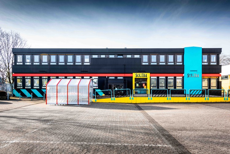 塞维利亚企业家 Pepa Bascón 二十年前决定搬到德国科隆市开辟商机。在酒店业摸爬滚打了几次过后,十多年前她决定在科隆市中心开设一家售卖西班牙产品的小商店,将她祖国最好的东西卖到德国来。多年后她的小店备受好评,因此她更雄心勃勃地决定组建一家批发店,以满足科隆和杜塞尔多夫周边意大利和西班牙餐厅日益增长的对西班牙产品的需求。因西班牙美食在德国人气大增,2016年 Pepa Bascón 决定在科隆打造一家新的“现购自运”的仓储式超市,为非专业客户提供特定服务。为此她联系 Masquespacio 为她设计新品牌和室内空间。这个新设计的Solera 超市占地约500平方米,走地中海风,并融合了这类企业所必需的功能特征。黑色的背景上点缀了西班牙风情的“欢乐“色彩,与黑色形成鲜明对比,这种设计并非典型的西班牙主题。其他诸如装饰线的网格,雨蓬以及典型的地中海瓷砖等元素让人们联想到了西班牙最南端的安达卢西亚。
