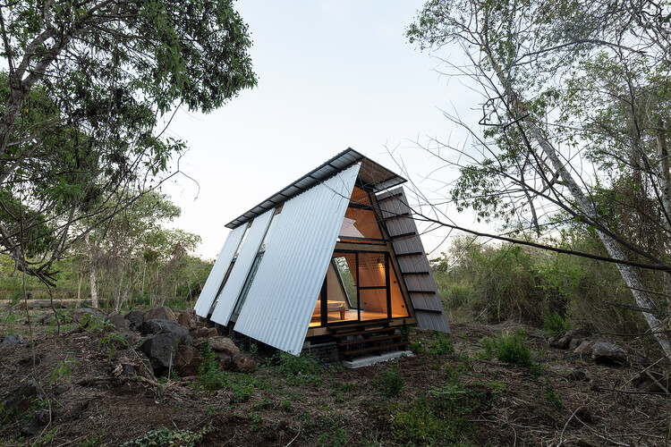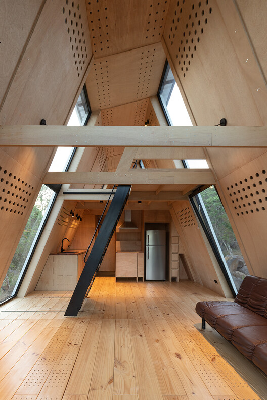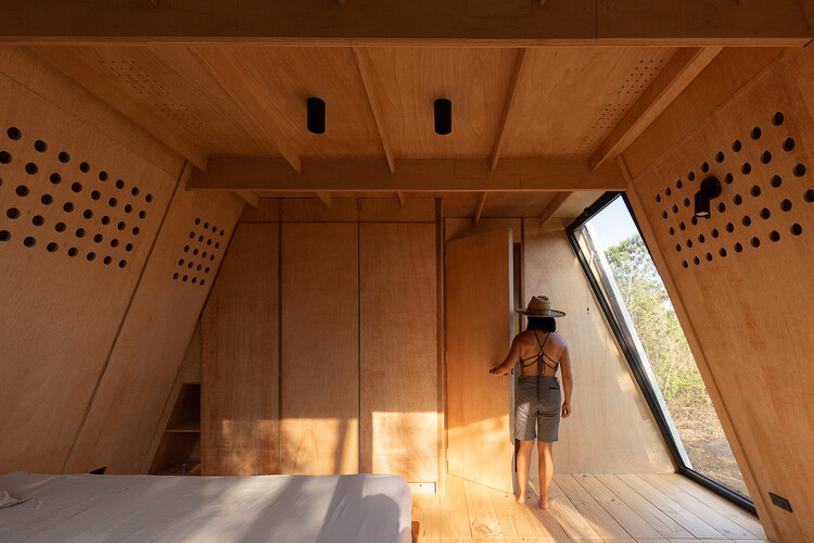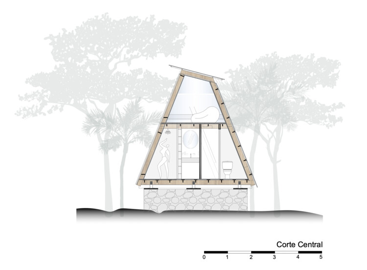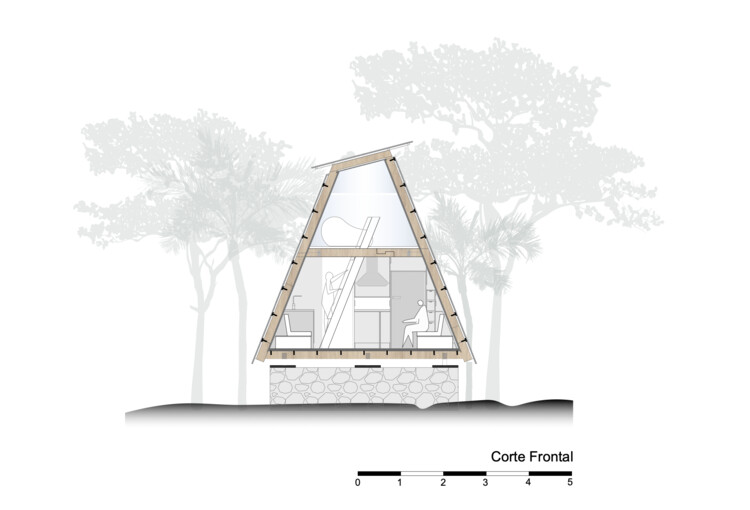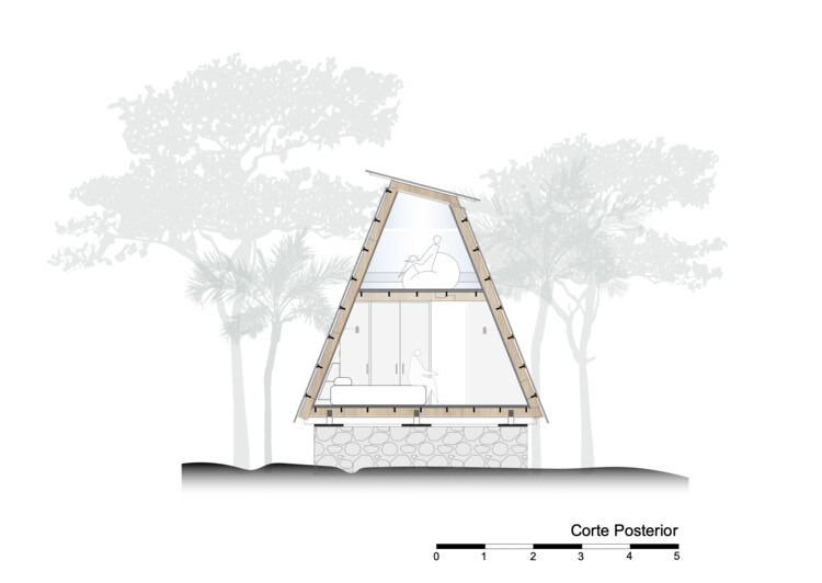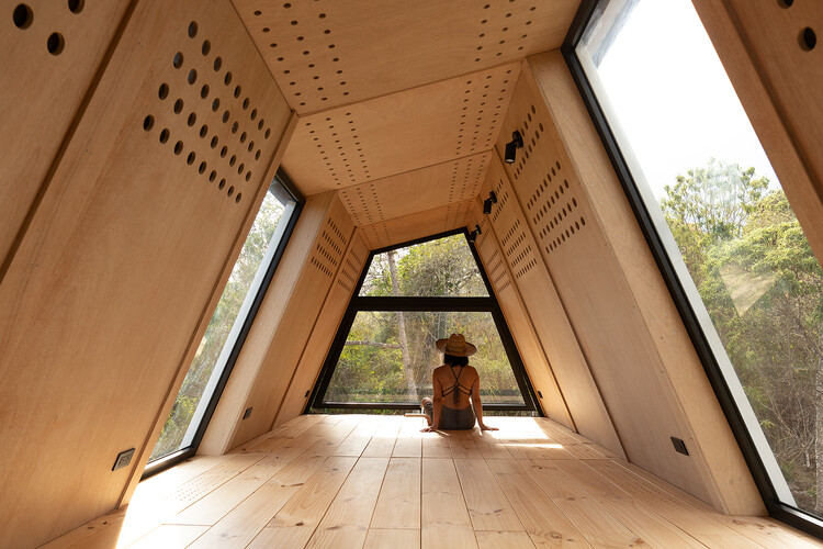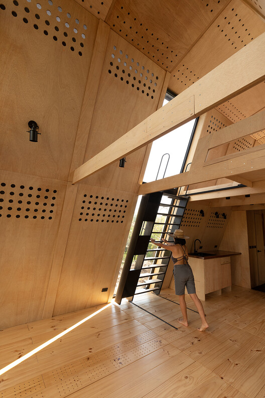 五种独特的材料:木材、石材、金属、玻璃和聚氯乙烯,以一种纯粹而相称的方式介入,整合出一种环境平衡的元素。每种材料的参与都是在高效和灵活的条件下筛选出来的。胶合板是最具代表性的材料,结构、内墙、家具和天花板都是用它建造的。精确的格式加上机械化的切割工艺,保证了资源的优化利用。屋顶由 PVC 板组装而成,起到遮阳和防水的作用。