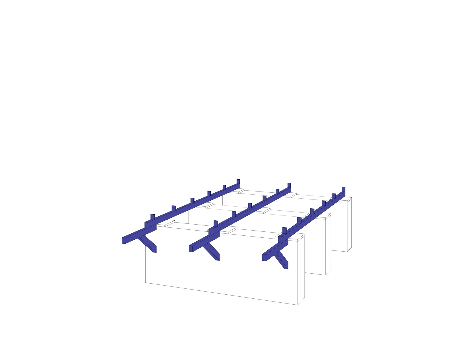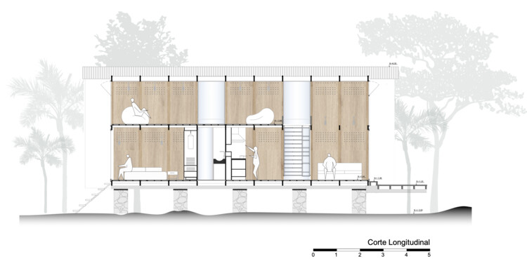 建筑。该设计通过动态热模拟,提出了合理的生物气候策略,兼顾了功能和室内舒适度。将建筑架空,可以利用惯性和气流在建筑结构下形成一个冷空气室。墙壁和屋顶形成双层结构,容纳结构梁,并形成另一个空气室,确保内部表皮的过度通风,地板和墙壁上的穿孔可以实现交叉通风。